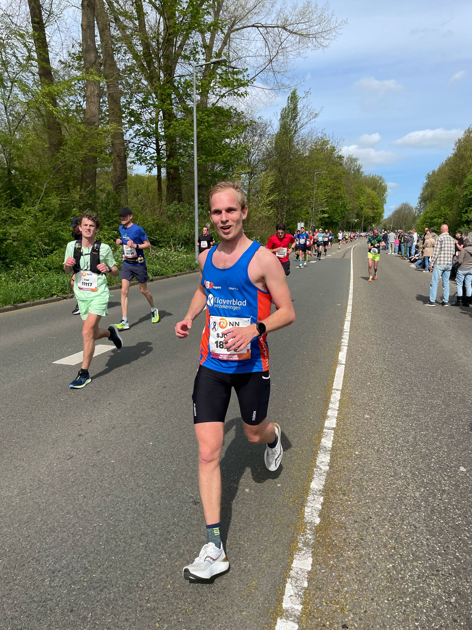 Maurits Bloem stond vandaag aan de start met een missie. Al een aantal marathonvoorbereidingen had hij gedraaid, maar blessures gooiden telkens roet in het eten. Nu was de voorbereiding beter dan ooit en blaakte hij bij de start van het zelfvertrouwen. En Maurits is een man met een duidelijk plan, laat weinig aan het toeval over. Dat plan voerde hij vandaag tot in de perfectie uit. Doel 1 was simpel: een succesvolle marathon en positieve ervaring neerzetten. En daarnaast onder de 2:50 lopen. Een realistisch doel, zo bleek. Waar veel lopers het moeilijk hadden in het zware stuk met wind tegen vanaf kilometer 35 denderde Maurits door en bleef een zeer vlakke race lopen. Maurits liep 2:48:31, 3:59 gemiddeld per kilometer. Na die tegenslagen smaakt deze prestatie extra zoet. ‘Een droom die uitkomt’, aldus Maurits. Dat een succesvolle marathon niet vanzelfsprekend is werd vandaag weer vaak duidelijk. Ook bij de 2 clubgenoten en trainingsmaatjes van Maurits. Vincent Buitenhuis en Maarten Nieuwenhuis liepen lang in hetzelfde groepje, maar kregen het onderweg zwaar. Vincent kende geen vlekkeloze voorbereiding in kreeg het na 25 kilometer al zwaar. Het tempo zakte, maar hij knokte zich naar de finish in 3 uur 12. Maarten moest helaas uitstappen omdat zijn bovenbenen besloten dat het mooi geweest was.